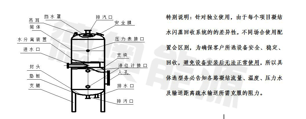 4.凝結(jié)水閃蒸回收裝置為非標(biāo)產(chǎn)品,即使處理量相同,設(shè)備實(shí)際尺寸會(huì)根據(jù)實(shí)際系統(tǒng)工況而針對(duì)性設(shè)計(jì);