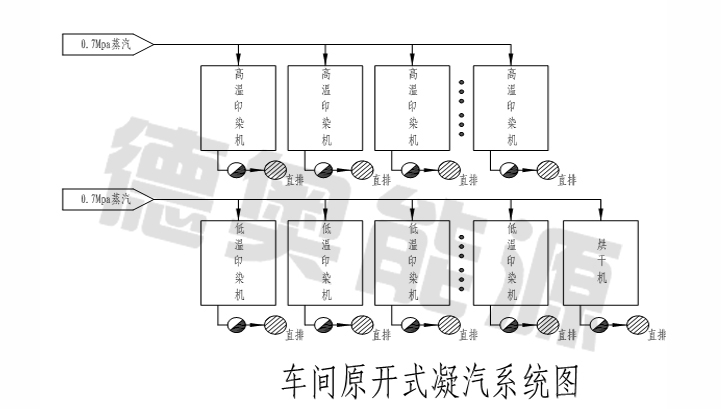 葫蘆島某紡織印染有限公司是一家集織造、染整、制衣和出口貿易為一體的集團化企業,生產技術和設備主要引自具國際先進水平的德、美、意、日等國家。現對冷凝水回收系統進行改造。應用現行最先進的閉式回收技術對坯布車間高溫印染機、低溫印染機和烘干機產生的冷凝水閉式再回收利用。最終達到最完全的凝水資源回收利用。此改造項目即可達到循環經濟的要求,也與國家能源政策相符合。