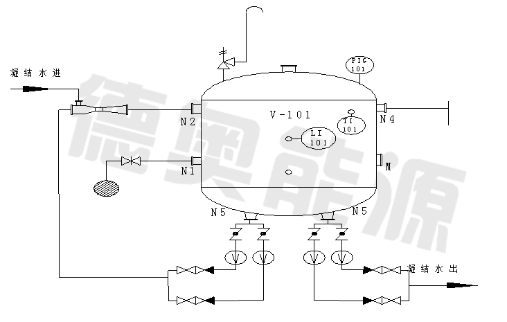 4、凝結水回收器的運行方式:負責給引射器提供引射水流的是兩臺高溫給水泵,一備一用,定時自動切換。另兩臺水泵負責往外送水,外送水泵設有三個水位控制點,低水位停泵,高水位啟動,超高水位雙泵運行。