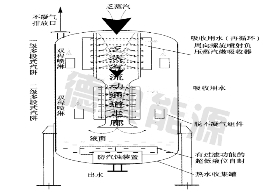 北京德奧公司則采用多段沿程走廊吸收方式,通過快速高效汽阱吸收室和多程噴射降淋室產生的卷吸作用,使乏汽在流動過程中被逐步分段吸收。由于乏汽一直處于流通中,系統不存在被憋壓的問題,而且乏汽流動窄間直徑大,可以確保低壓乏汽能夠大量流過和吸收,尤其適合于乏汽流量壓力不穩定、排汽設備對排汽背壓比較敏感、分離不凝氣體較多的場合。DA-FH系列乏汽回收器是此類技術的代表。